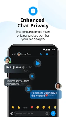 Az imo sokkal többet kínál, mint egyszerű szöveges üzenetek. Fejezd ki magad teljes mértékben a barátaiddal és családoddal képek és hangüzenetek megosztásával. Tedd még személyesebbé a beszélgetéseidet az ingyenes, kifejező matricák széles választékával, amelyekkel minden érzelmet kifejezhetsz. Hozz létre könnyedén csoportokat barátaiddal, családtagjaiddal, kollégáiddal vagy akár szobatársaiddal, és élvezzétek a közös élmények megosztását, a fotók egyszerű böngészését és a gondtalan csevegést egyetlen, intuitív felületen.