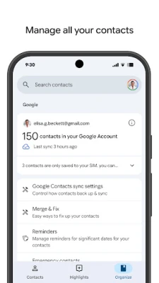 A Névjegyek biztonságos mentést és szinkronizálást biztosít az összes eszközön. Tárolja névjegyeit Google-fiókjában, bárhonnan hozzáférve. Rendszerezze, szerkessze és állítsa vissza a törölt bejegyzéseket, soha többé ne feledkezzen meg a fontos évfordulókról.