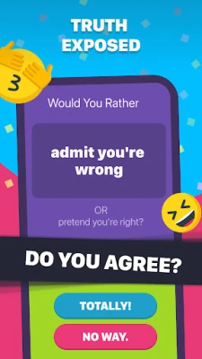 A Would You Rather Question Game a tökéletes társasjáték, mely vicces és elgondolkodtató kérdéseken keresztül hoz nevetést és vitákat. Fedezz fel meglepő igazságokat barátaidról lehetetlen döntésekkel. Több ezer dilemma vár, ideális partikra és jégtörőnek. Válassz 'ez vagy az' között, és lásd, ki mer a legmerészebb lenni!
